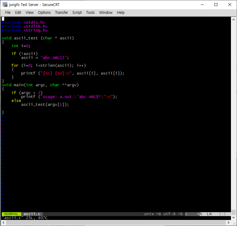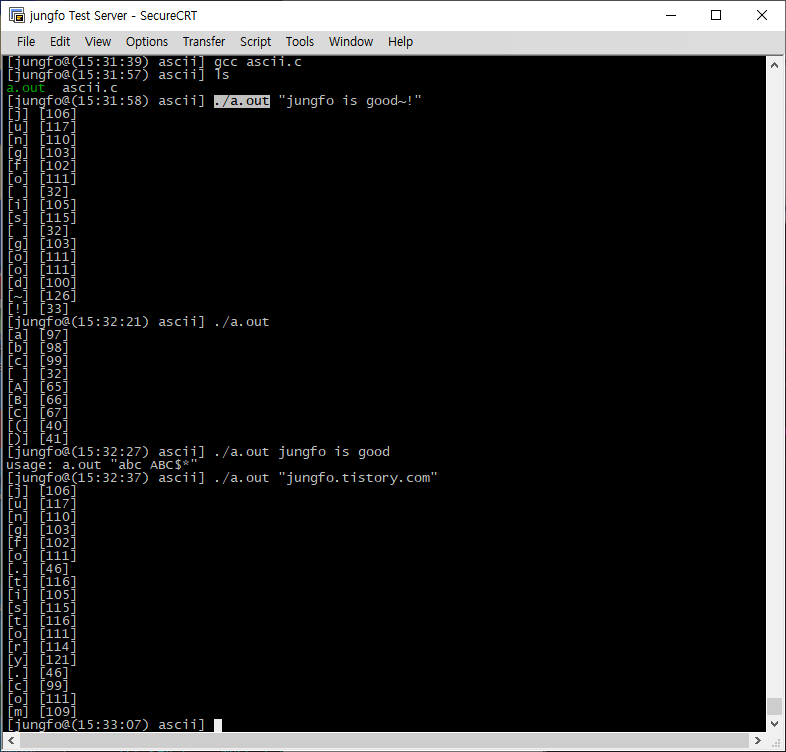 gcc 로 간단하게 컴파일하고 실행을 하면 입력된 문자열의 ascii 코드값을 확인할 수 있습니다. "jungfo is good~!" 이란 문자열과 "jungfo@tistory.com" 이란 문자열의 ascii 코드값들을 확인할 수 있습니다.
