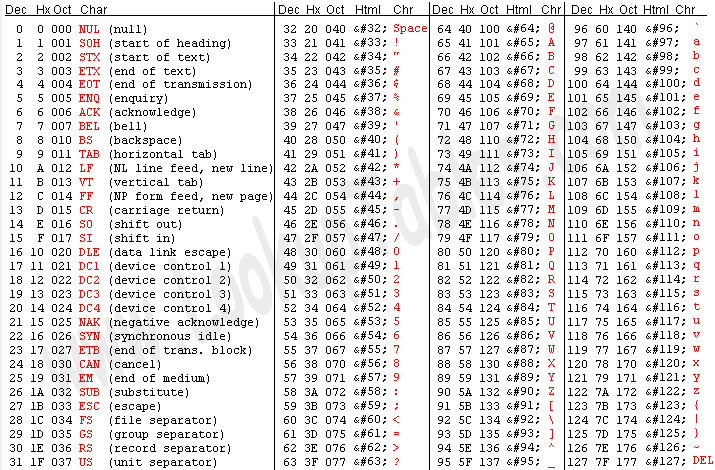 아래는 ASCII 문자 테이블이며 0~32번까지 처음 32개의 문자는 현재는 사용되지 않습니다. ASCII는 실제로 텔레타이프와 함께 사용하도록 설계되었으므로 설명이 다소 모호합니다. Notepad.exe 에서 ASCII 텍스트를 생성하거나 MS Word에서 파일을 '텍스트 전용'으로 저장하는 것이 바로 ASCII 형식으로 저장하는 것입니다.