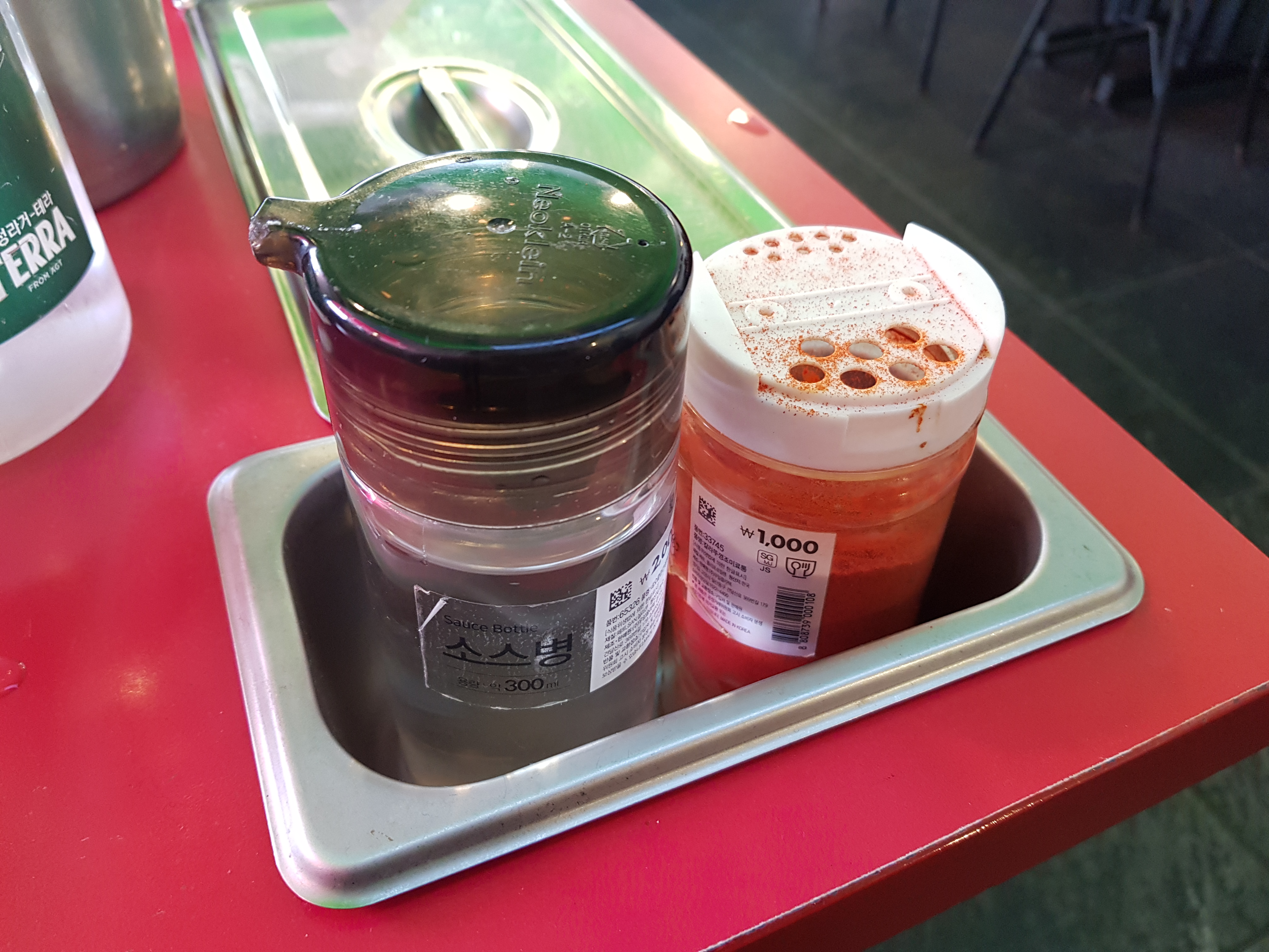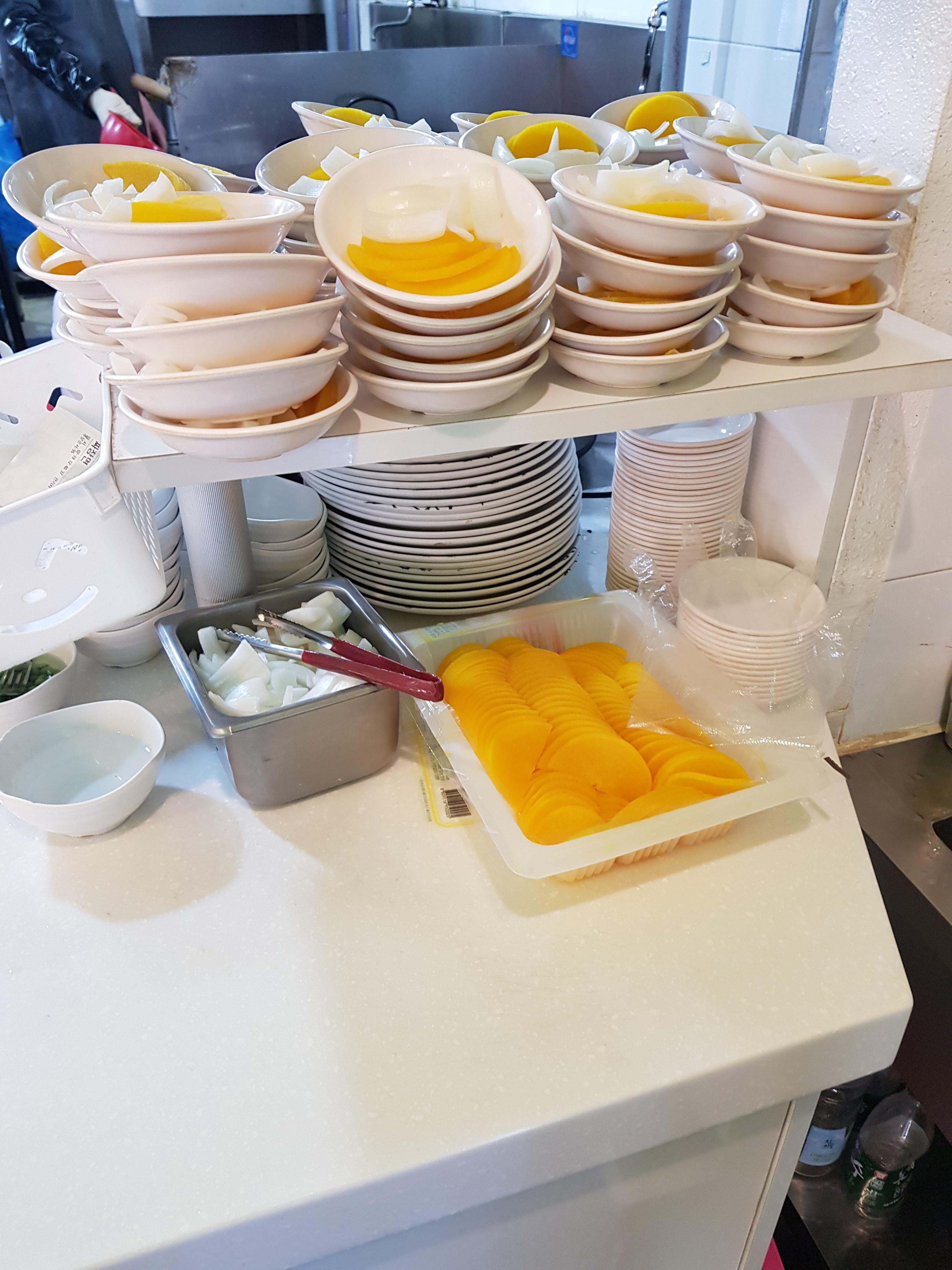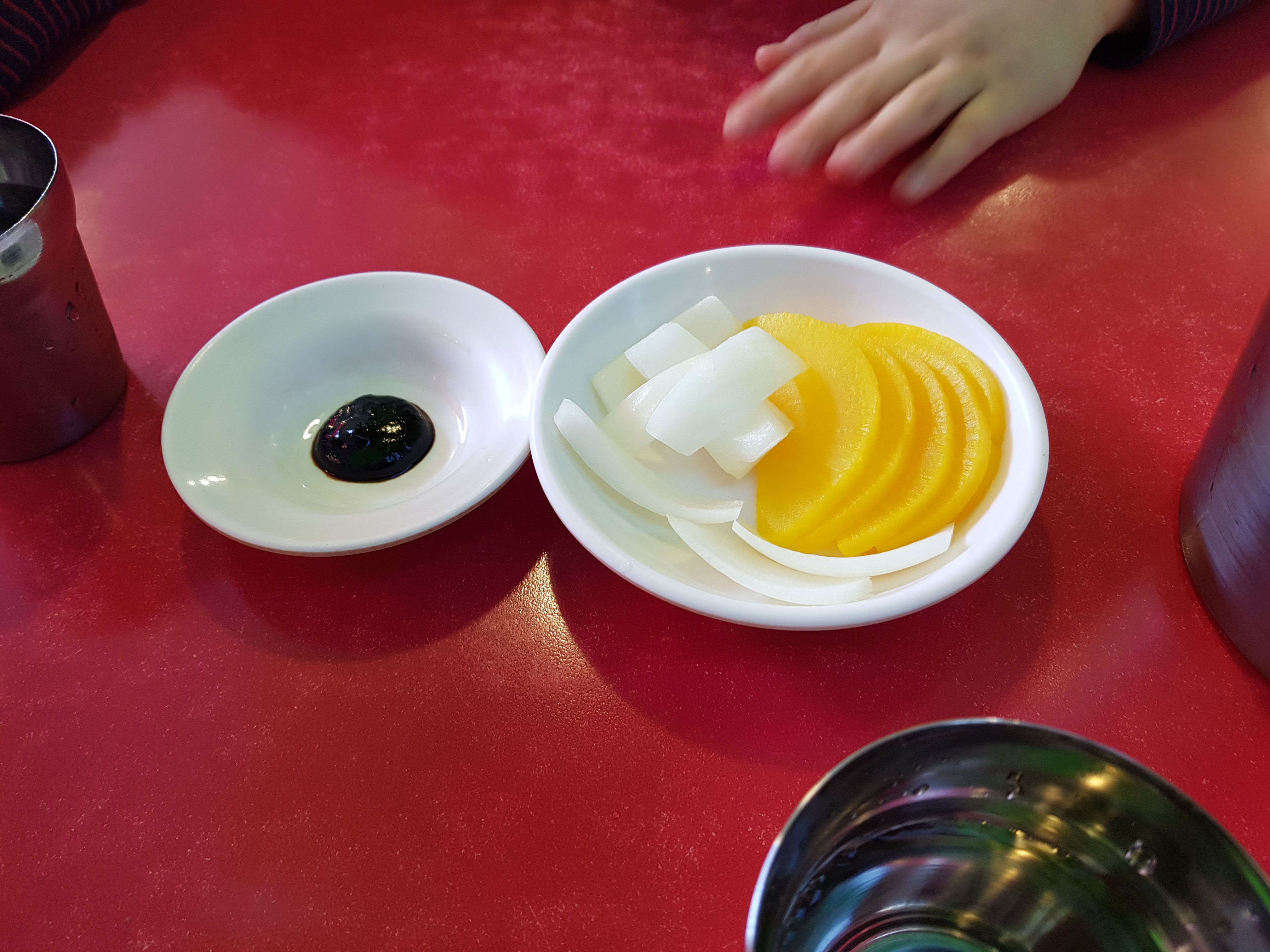 가게 내부는 사람이 너무 많아서 찍을 수 없었습니다. 기본찬으로는 단무지, 양파 나왔고 고추가루, 식초 준비되어 있습니다.