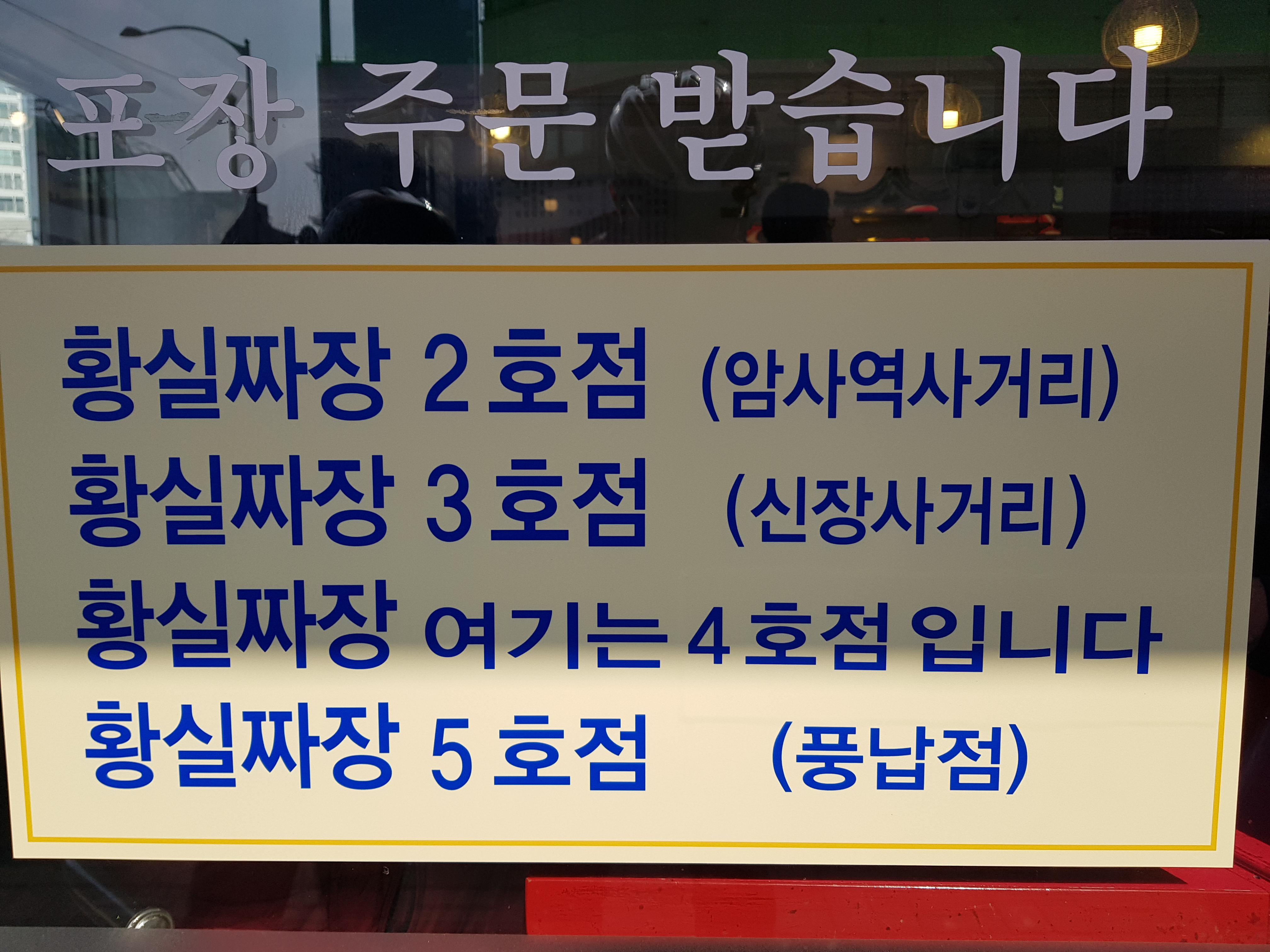 황실짜장은 5호점까지 있는 것 같습니다. 제가 방문한 곳은 황실짜장 4호점입니다. (1호점은?? 안 보이네요.) 어쨌든 간판을 보니 정말로 짜장면을 1,500원에 판매하는 곳 같습니다.
